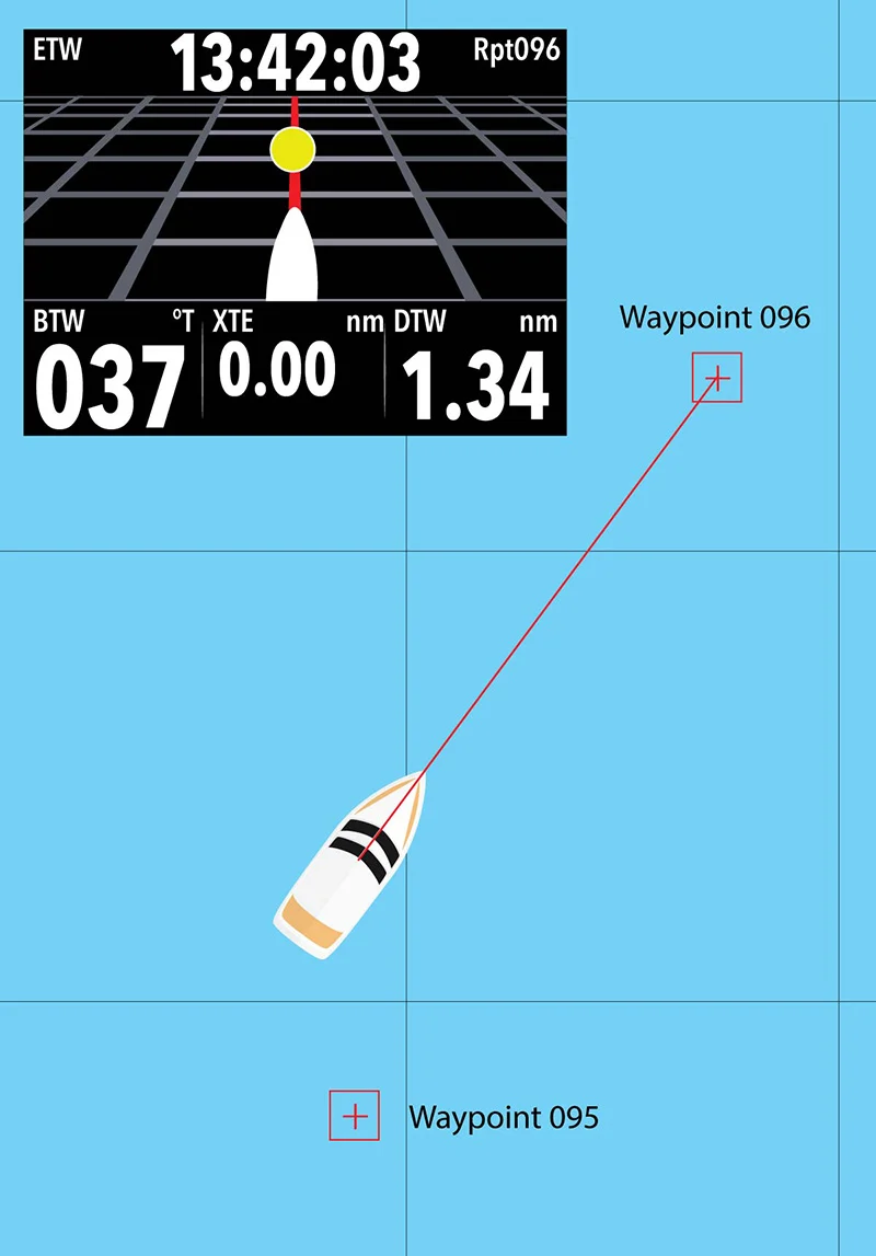 Представьте, что вы прекратили движение по тому же маршруту, а затем возобновили навигацию, выполнив команду GoTo, чтобы перейти от вашего текущего положения к путевой точке 096. Используя тот же пример на рис. 4, мы видим, что азимут и расстояние до путевой точки являются то же, что на рис. 3, но XTE составляет 0,00 нм, когда мы начинаем GoTo. Это связано с тем, что команда GoTo проложила новый путь от текущего положения лодки до путевой точки.