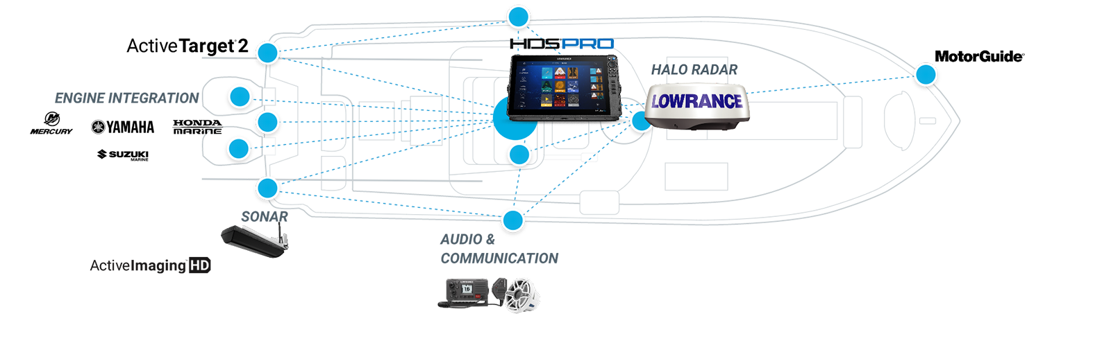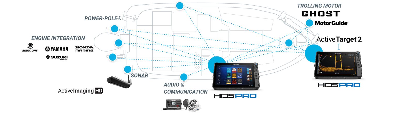 HDS ® PRO является сердцем Ultimate Fishing System, обеспечивая управление лодкой от носа до кормы, включая троллинговые моторы, Power-Pole, автопилоты, двигатели, радар и многое другое.