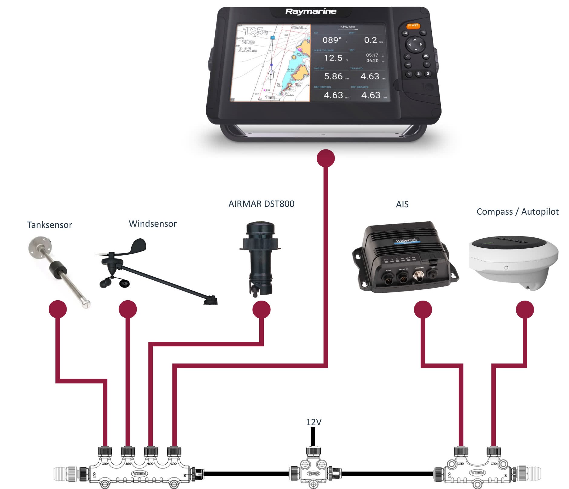 Data input: engine, tank sensor, compass, AIS, depth, wind and speed data Data output: GPS data for radios, waypoints and routes for autopilot |