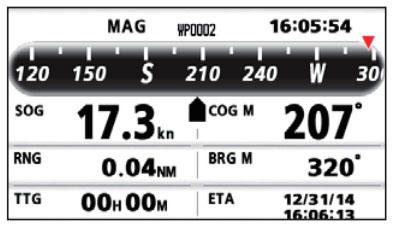 В этом режиме отображается состояние приема GPS, положение судна по широте и долготе, скорость относительно земли, курс относительно земли, дата и время.