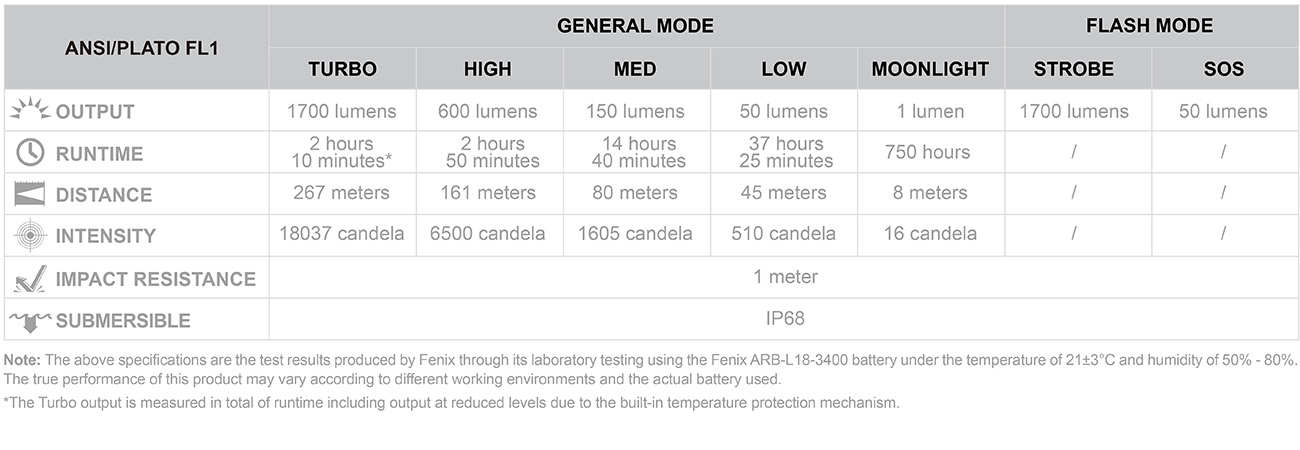 Фонарь работает от батареи Fenix ARB-L18-3400. Полностью аккумулятор заряжается в течение 1,5 часа. Вместе с аккумулятором модель весит всего 132 грамма. Световой индикатор оповещает о низком заряде батареи. Также фонарь дополнительно оснащен запатентованной системой защиты от перегрева. Прочный цельнометаллический корпус анодирован покрытием, которое защищает фонарь от внешних повреждений. Дополнительную защиту обеспечивает стандарт водонепроницаемости IP68. Этот класс защиты означает, что в корпус не попадут частички пыли и грязи. Ударопрочность фонаря составляет 1,5 метра. Размер фонаря не превышает 129,7 x 26,5 x 22,6 миллиметров.