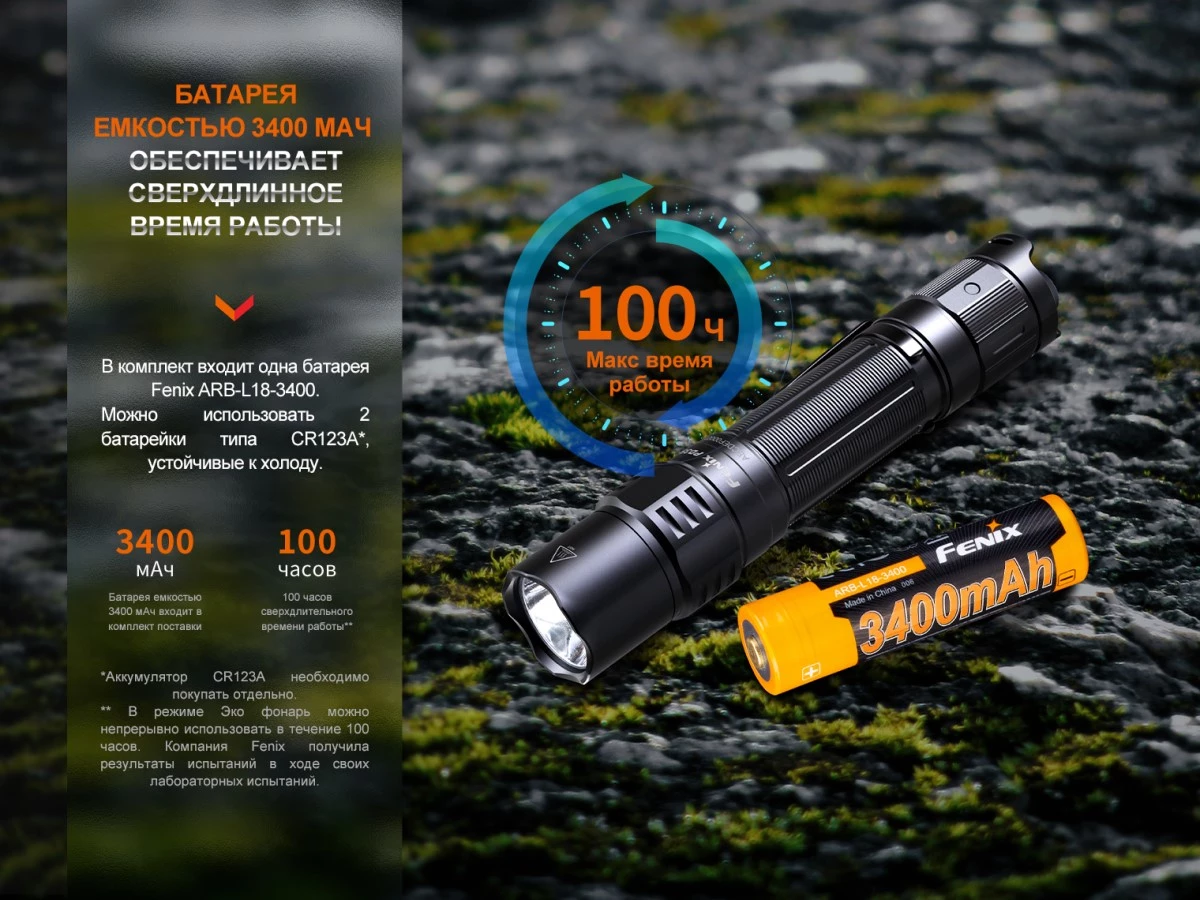 - тип питания – Li-ion аккумулятор Fenix ARB-L18 3400 мАч или две батареи CR123A;