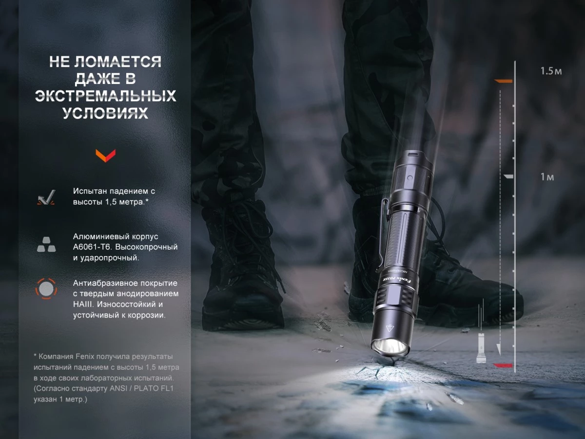 Модель выдерживает эксплуатацию в экстремальных условиях благодаря износостойкому корпусу из авиационного алюминия A6061-T6. Металл дополнительно обработан методом жесткого анодирования, что делает материал еще более прочным и окрашивает поверхность в характерный черный оттенок, на котором не видны отпечатки пальцев и мелкие царапины. Ударопрочность корпуса составляет 1 метр.