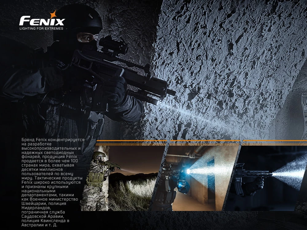 Чтобы сделать фонарь еще более практичным и функциональным, можно воспользоваться специальными аксессуарами Fenix. Например, кнопкой для удаленного управления режимами – AER-5. С помощью крепления ALG-05 можно эту кнопку удобно разместить на цевье ружья, а крепеж ALG-00 надежно зафиксирует сам фонарь. Также можно воспользоваться фильтрами AOF-M (цветовым) и AOT-M (сигнальным).