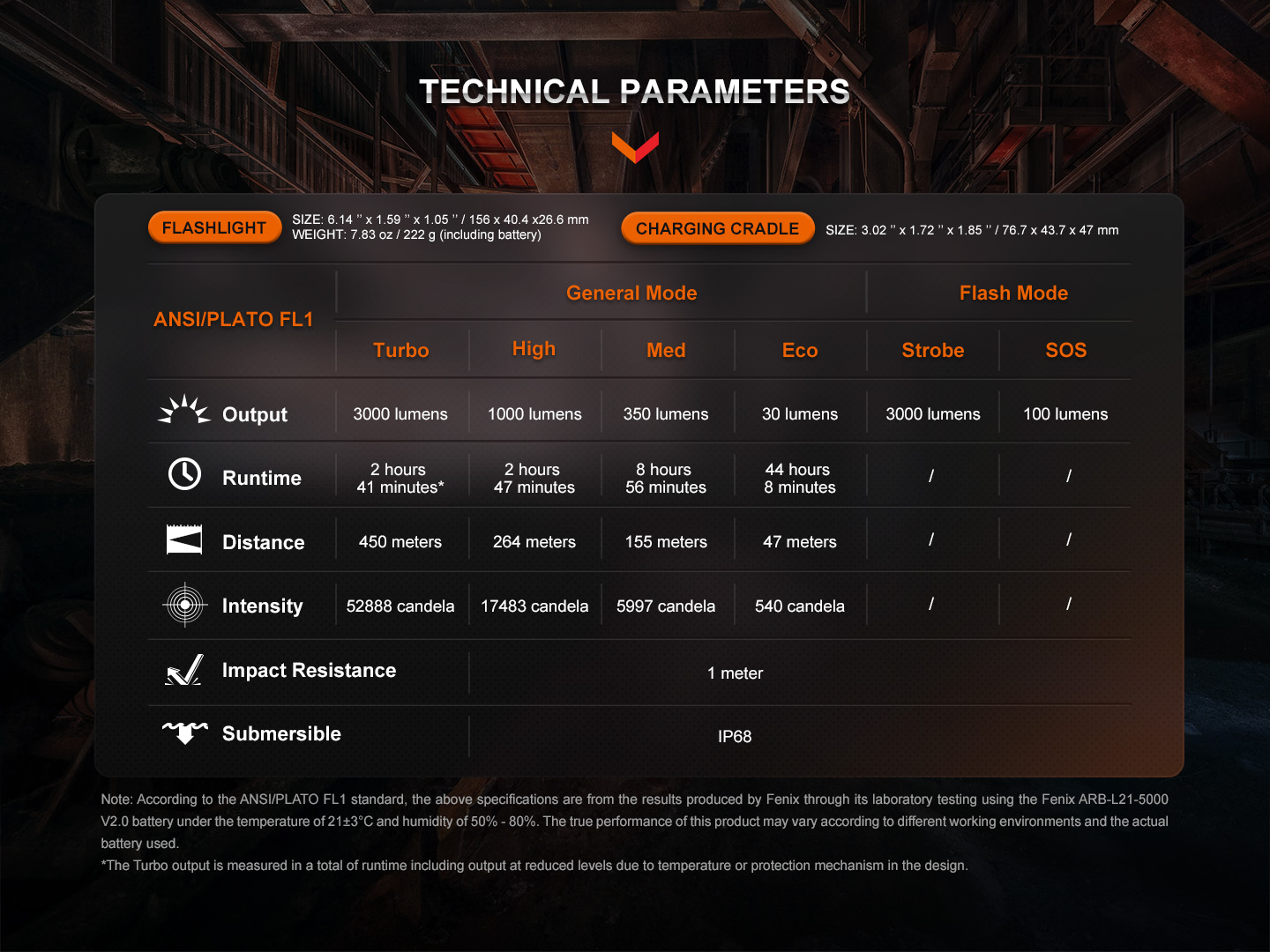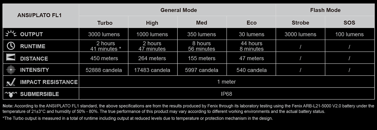 Указанные параметры работы получены при лабораторных опытах с использованием фирменной батареи ARB-L21-5000 V2.0. Температура составляла 21 +-3 градуса Цельсия, а влажность воздуха – около 50%-80%. При иных условиях внешней среды, а также в зависимости от задействованного аккумулятора, показатели свечения фонаря могут быть другими.